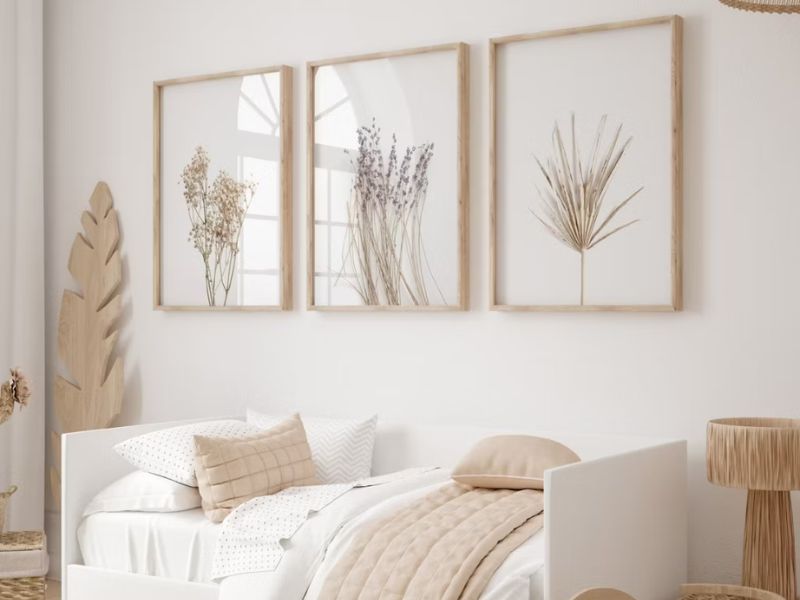Quadros minimalistas são perfeitos para quem quer decorar sem exagero. Por exemplo, line art, preto e branco e formas simples funcionam muito bem. Além disso, você nem precisa lotar a parede: um ou dois quadros já deixam o ambiente elegante, com aquela beleza sutil que não enjoa.